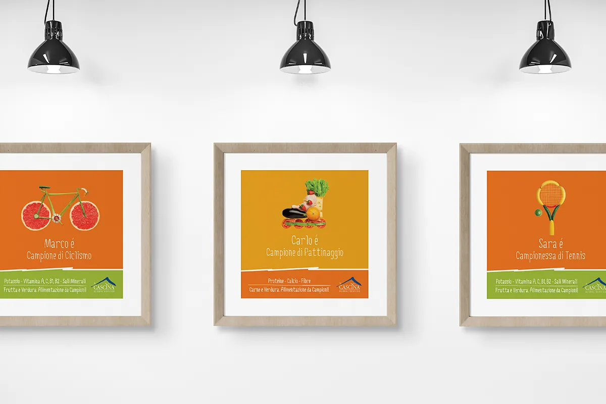 La sfida era sensibilizzare bambini e adolescenti a una corretta alimentazione senza ricorrere a imposizioni noiose. Abbiamo realizzato una serie di poster con grafiche accattivanti e dinamiche, affisse direttamente nelle mense. Associando frutta e verdura al rendimento sportivo e scolastico, abbiamo catturato l’attenzione dei ragazzi, veicolando un messaggio educativo potente in modo leggero, empatico e visivamente stimolante.