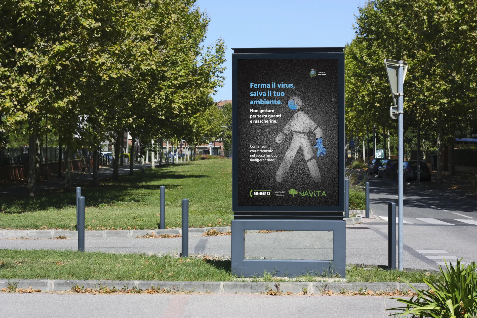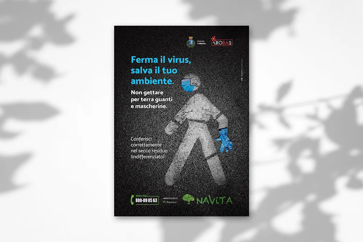Durante l’emergenza sanitaria, l’abbandono di dispositivi di protezione (mascherine e guanti) era diventato un problema ambientale critico. Navita aveva l’urgenza di sensibilizzare la popolazione su questo tema, promuovendo comportamenti corretti per tutelare il decoro urbano e la salute pubblica.