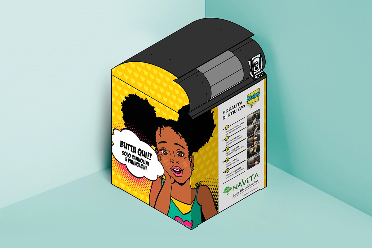 La sfida consisteva nel valorizzare i contenitori per i rifiuti tessili sanitari, elementi tradizionalmente anonimi e dal basso profilo estetico. La soluzione adottata si è tradotta in una strategia visiva audace, ispirata alla Pop Art di Andy Warhol: l’impiego di cromie sature e di un linguaggio iconico ha ridefinito l’aspetto dei contenitori, conferendo loro una nuova dignità artistica. Il risultato è un elemento di arredo urbano contemporaneo che dialoga con la vivacità del contesto, nobilitando il gesto del conferimento e migliorando la percezione complessiva del decoro cittadino.